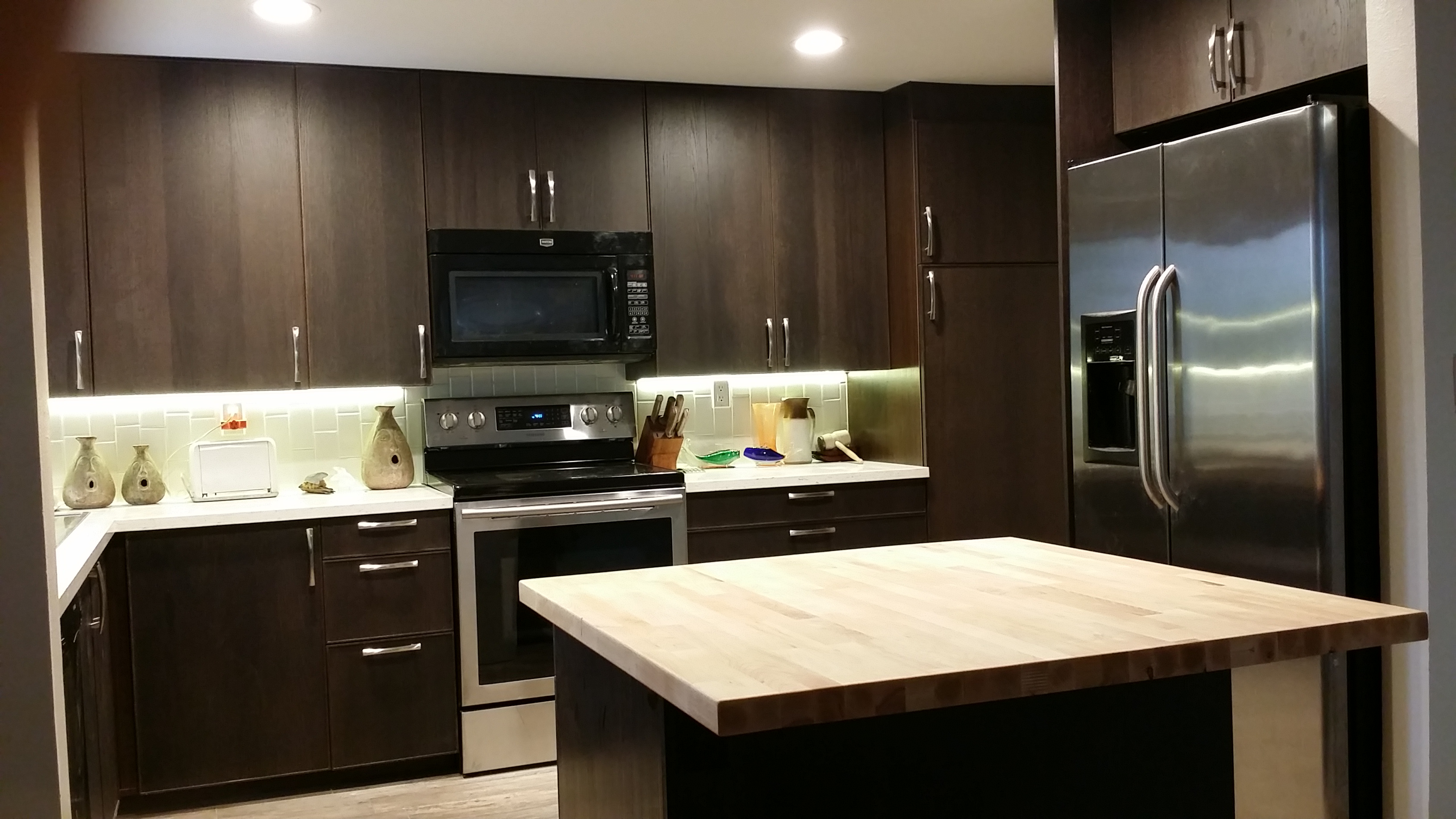 The Chadbourne kitchen is a clean line example of how we use an wood topped island to break up the space. The stainless steel stove and refridgerator set the tone for the handle accents and the contrast in the light wood floor and cabinets create a classy contrast in wood tones.
